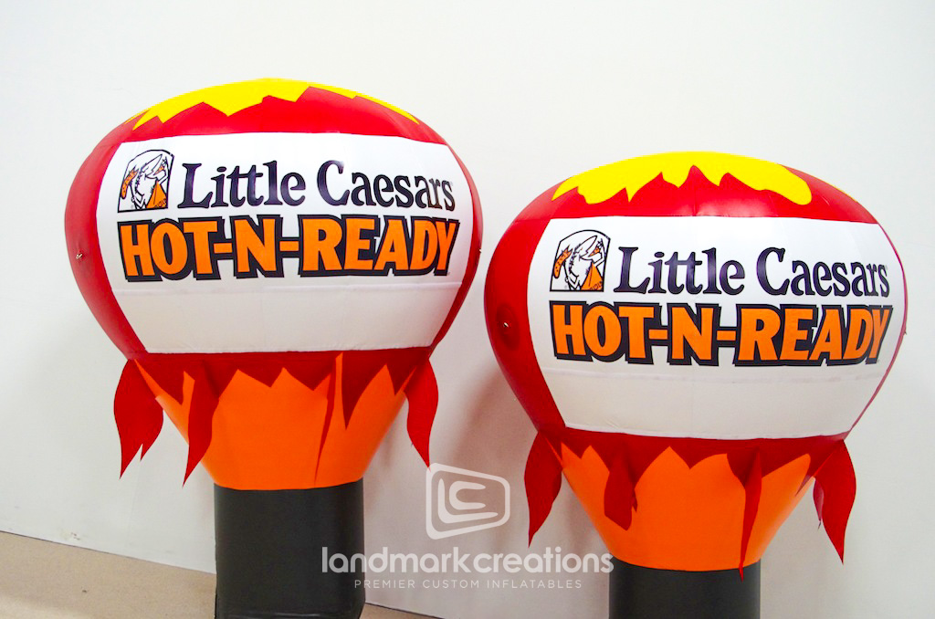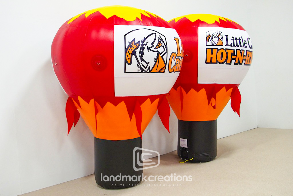 The custom Little Caesars hot-air shaped inflatable, crafted for International Mascot Corporation, exemplifies Landmark Creations' ability to produce highly detailed and impactful promotional pieces. This hot air balloon shape inflatable featuring their Hot-N-Ready offering on the banner area is designed for brand visibility, and delivers a striking visual presence perfect for events or aerial advertising. The durable materials and expert craftsmanship reflect our commitment to quality in every project, helping brands leave a lasting impression.