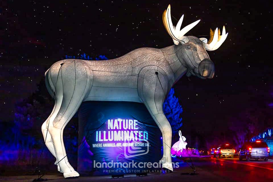 What could be more welcoming than at thirty-foot inflatable moose? The Minnesota Zoo created this giant moose display as a statement piece at the entrance of their "Nature Illuminated" outdoor event. The shape allows ample space for messaging which can be easily updated as needed between events.