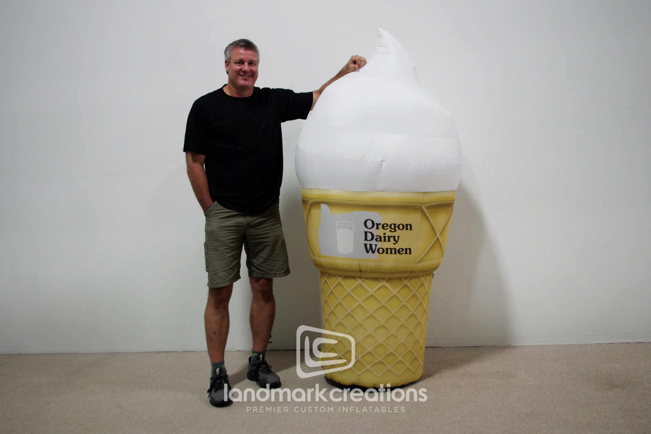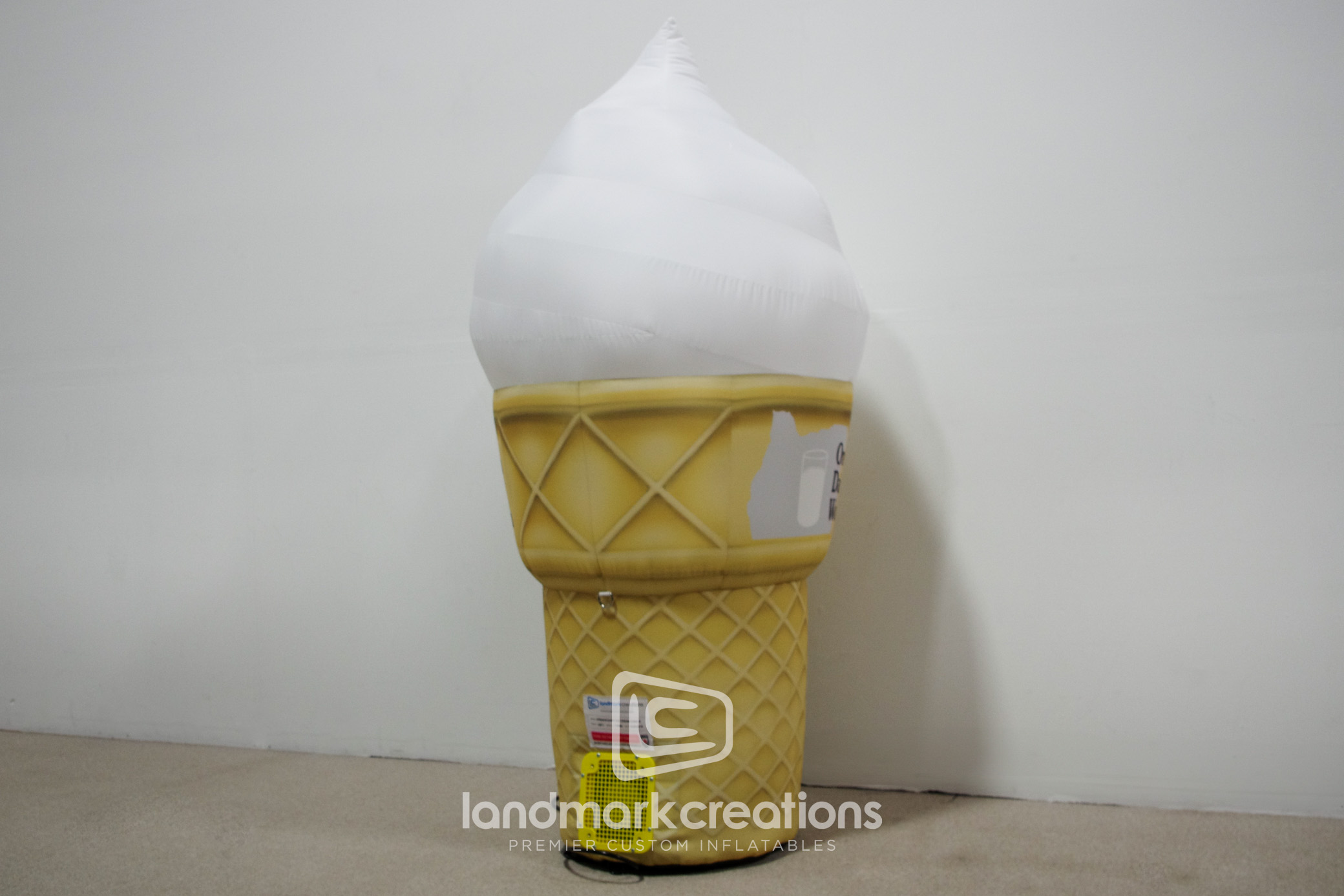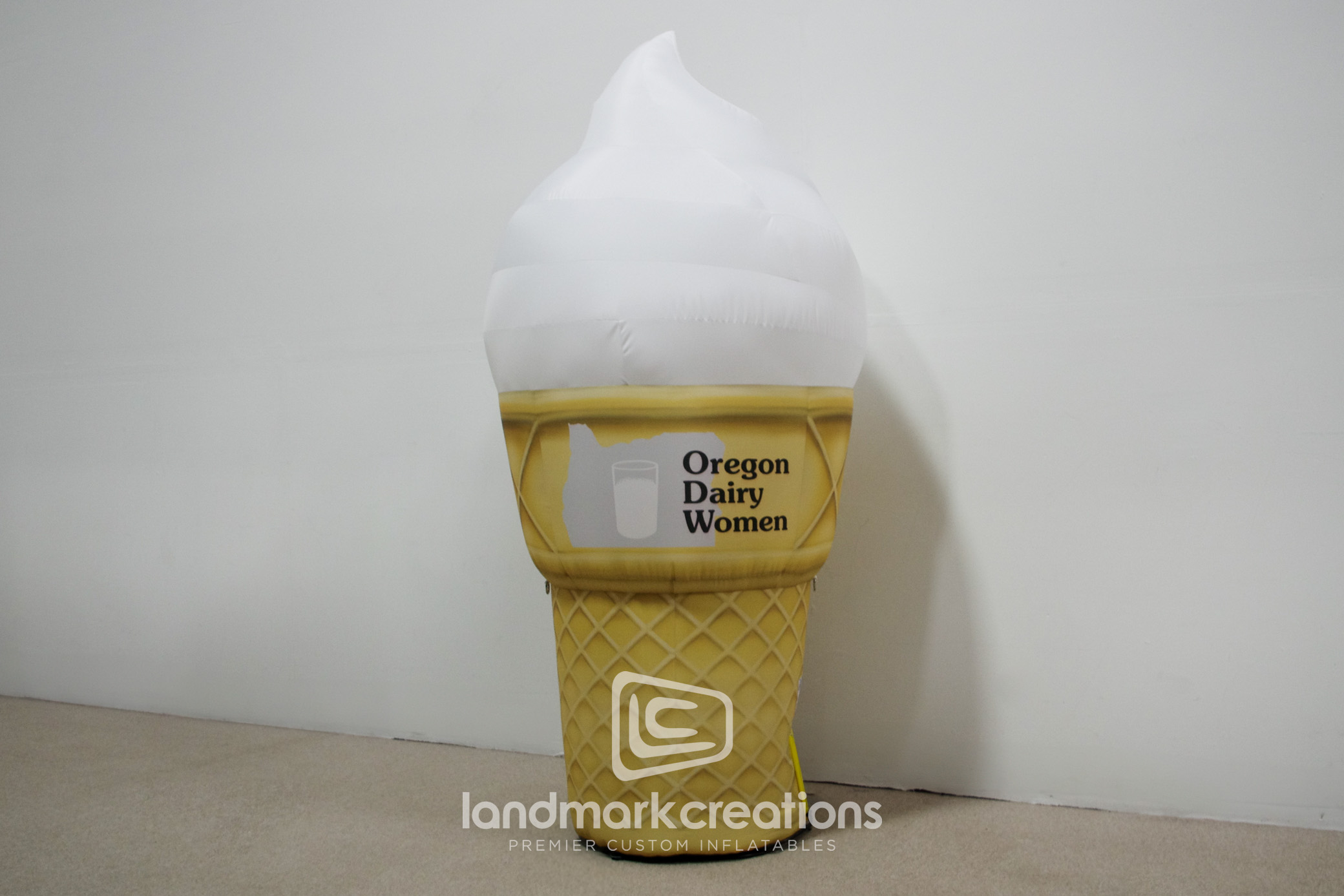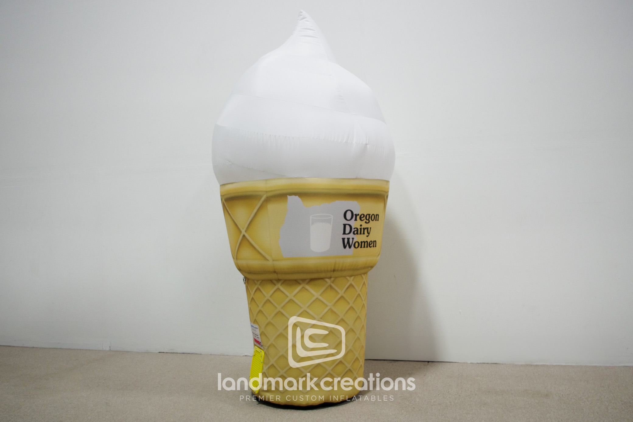 The Oregon Dairy Ice Cream Cone is a 6-foot tall custom inflatable designed to promote Oregon Dairy's ice cream products. This delightful replica attracts customers at fairs, festivals, and in-store events, enhancing brand visibility and enticing ice cream lovers of all ages.