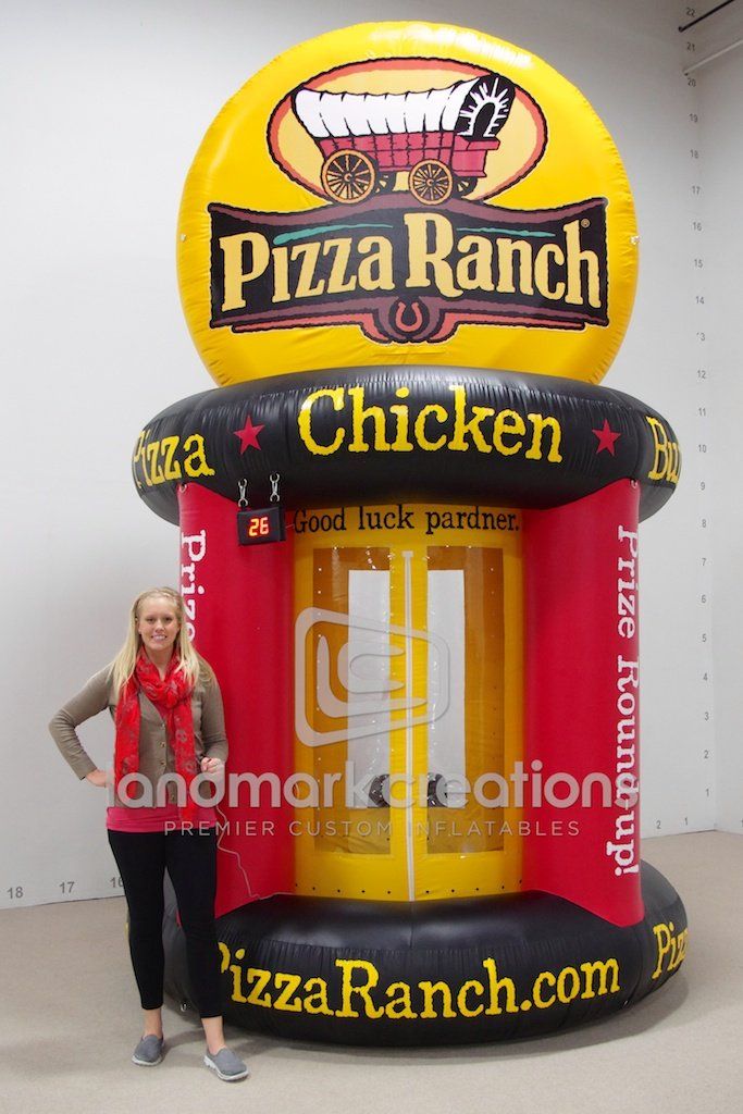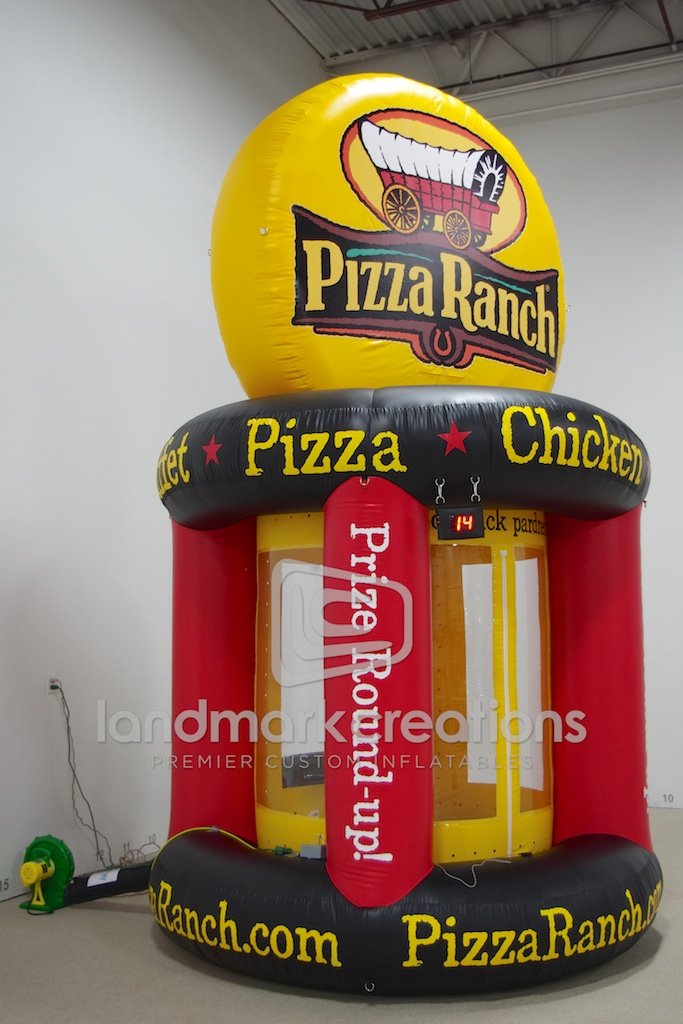 Pizza Ranch gets fan participation at the Iowa Speedway with this custom inflatable money machine. Fans jump into the cash booth, inflated at the winner's circle of the race track, for a chance to win Pizza Ranch coupons.