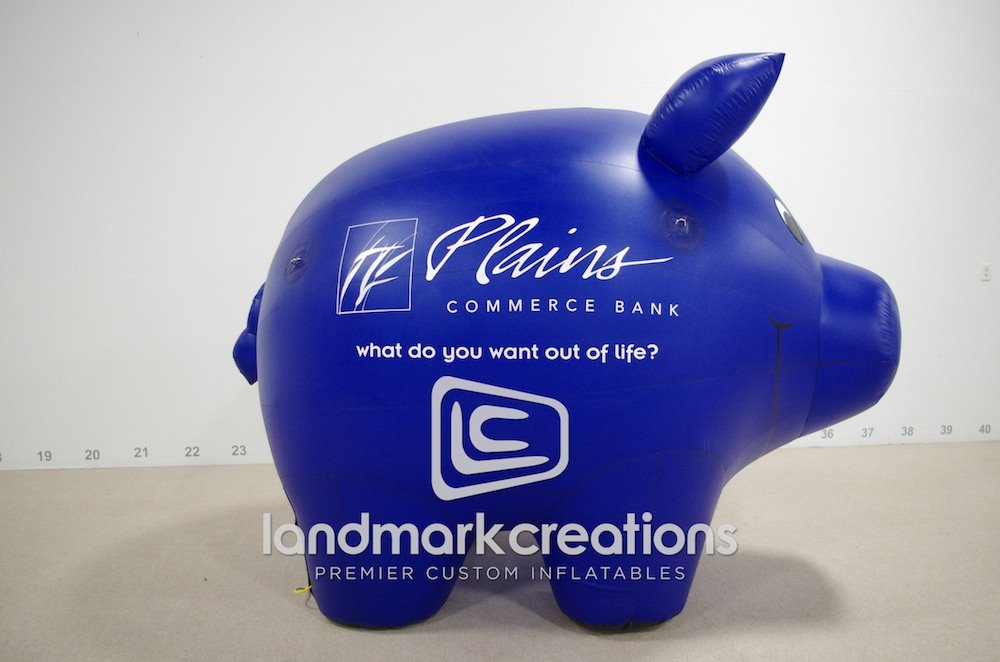 Custom inflatables add interest to community events and promotions. This inflatable piggy bank for Plains Commerce Bank increased visual appeal at marketing events.