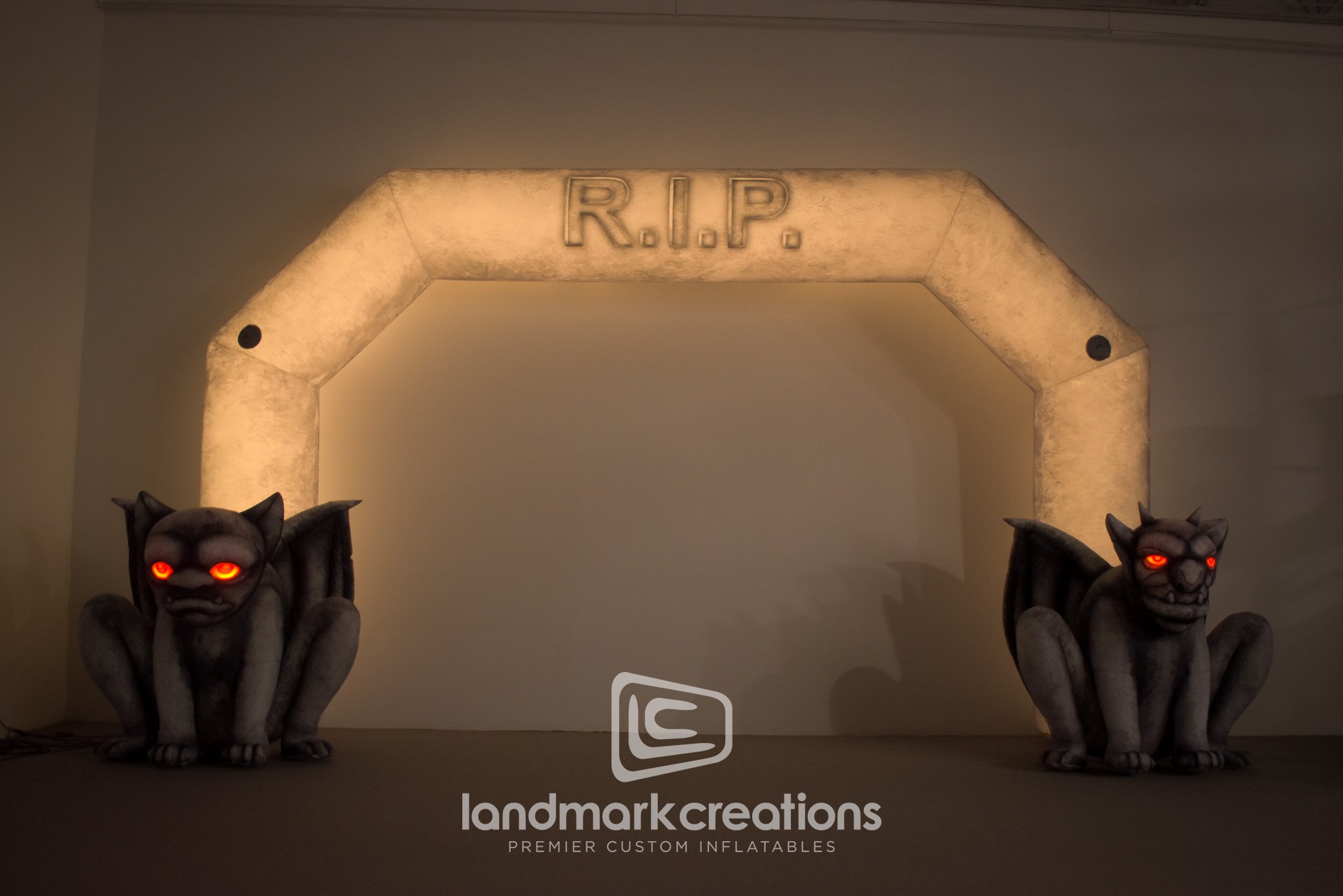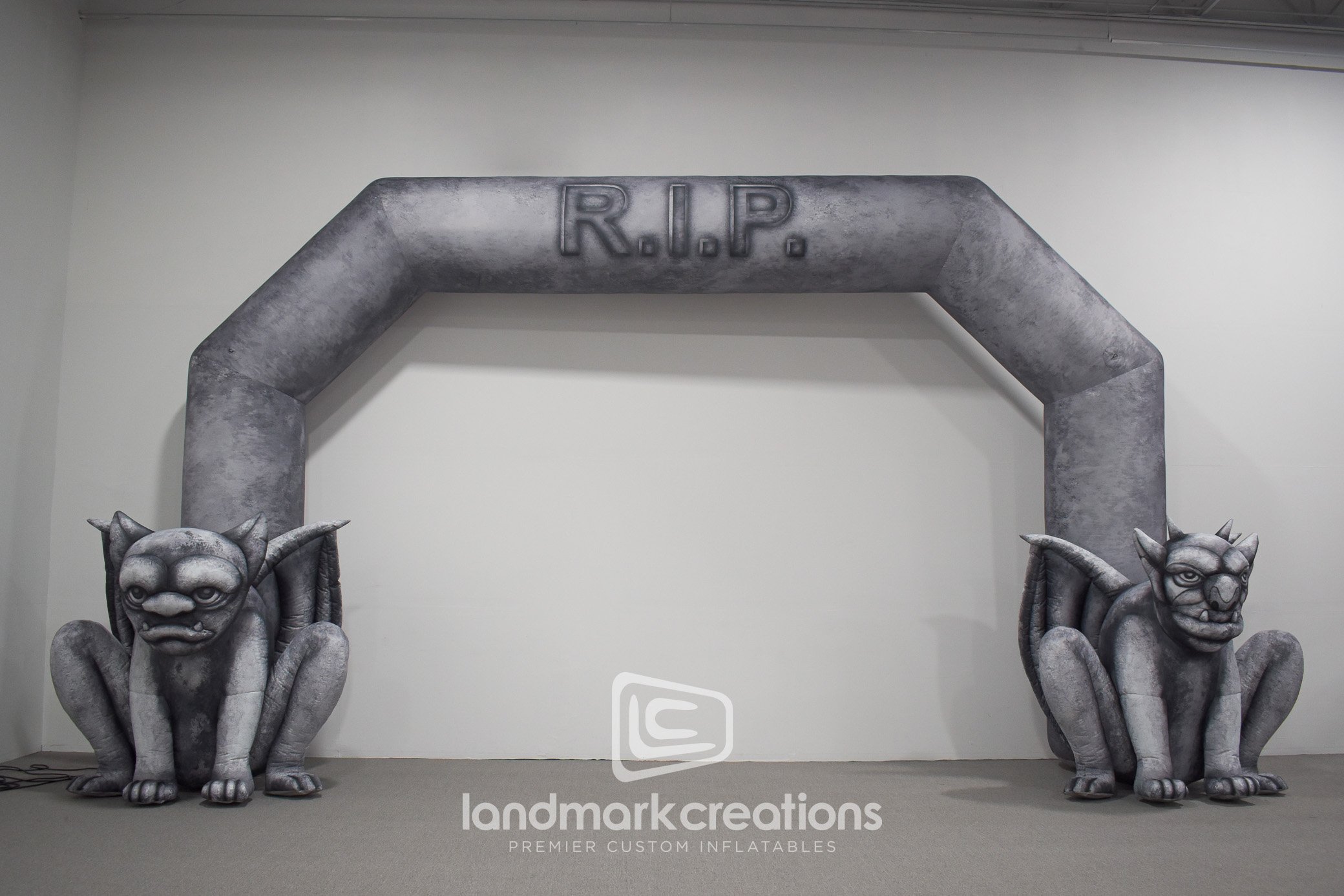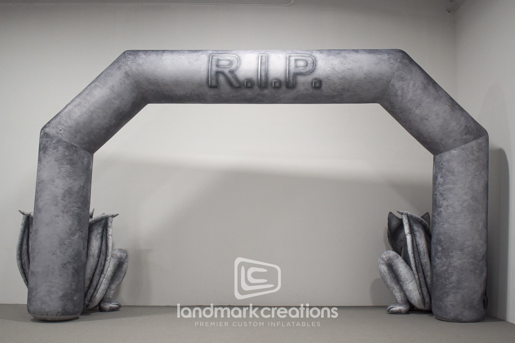 This Halloween-themed custom inflatable entrance arch was designed for the City of Plano, Texas for use at city festivals and events, including the Rest in Plano (RIP) Fest. Guests are greeted by the eerie glow of the inflatable arch's internal lighting system, which cast an otherworldly ambiance. The arch features two intricately designed gargoyle shapes seated at either leg, their watchful eyes capturing the essence of the Halloween spirit. Crafted with attention to detail, our custom inflatable entrance arch is not only a visual delight but also a durable and practical solution for outdoor events. It is designed to withstand the elements and provide a long-lasting presence at festivals throughout the Halloween season.
