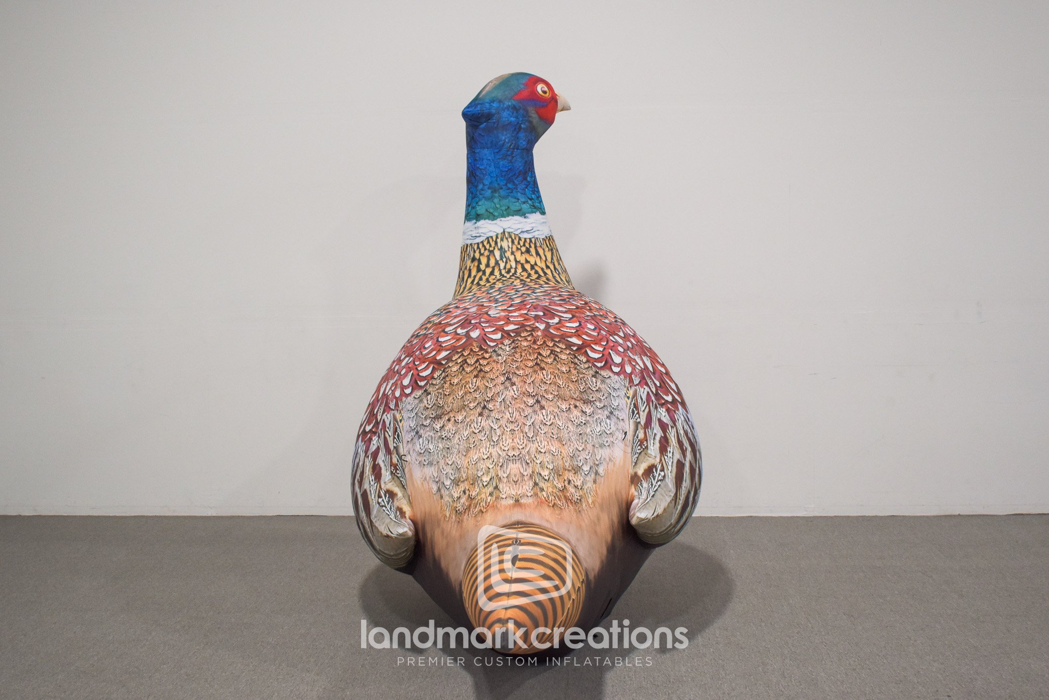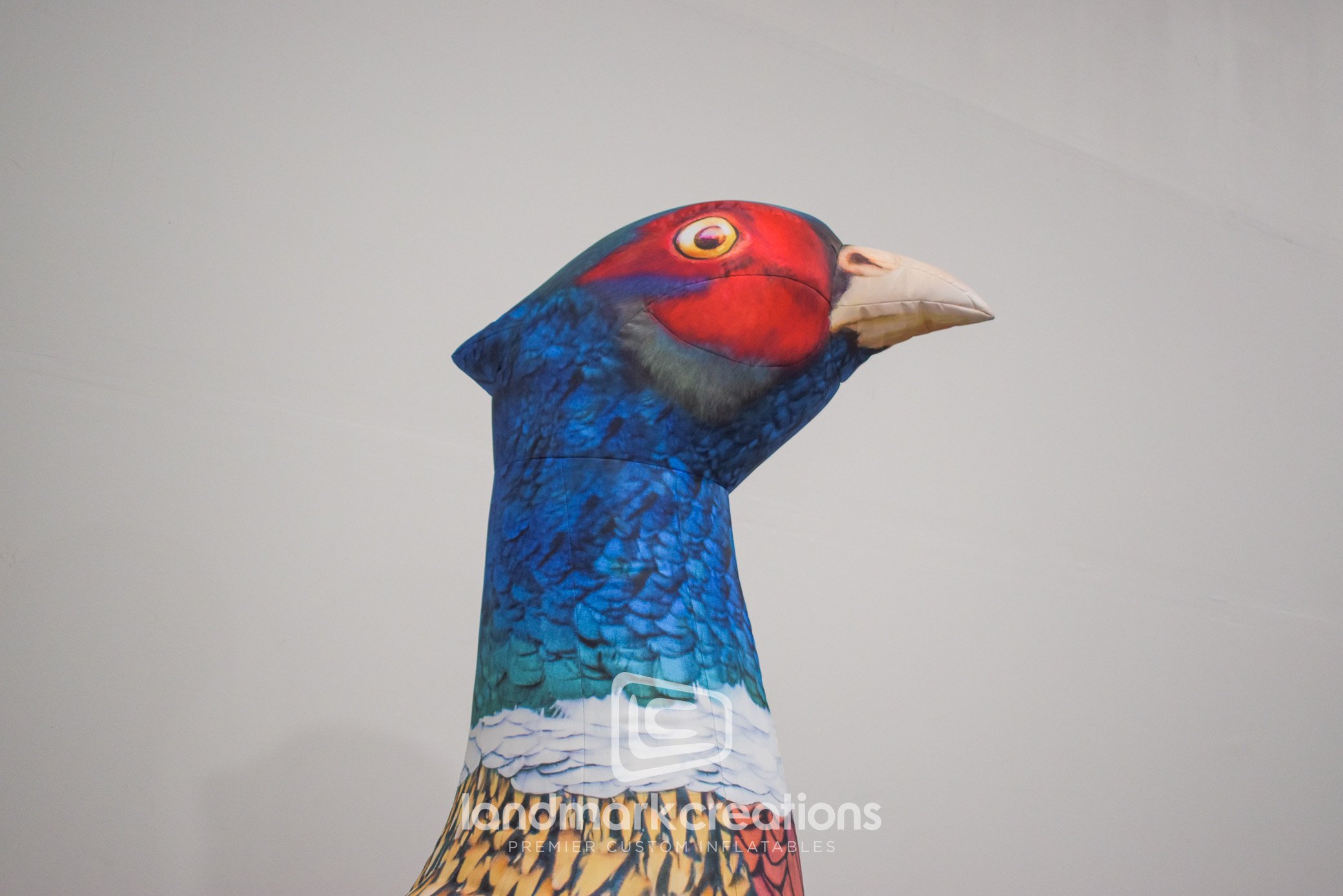 This custom inflatable pheasant display greeted guests at Aberdeen Area Convention & Visitors Bureau's trade show booth Pheasant Fest in Minneapolis. The high detail the giant inflatable rooster pheasant's plummage creates a very realistic effect that is very eye-catching given the size of the 8 x 13-foot bird. Custom inflatable shapes pack small, so they're also easy to transport and store between trade shows and other special events.