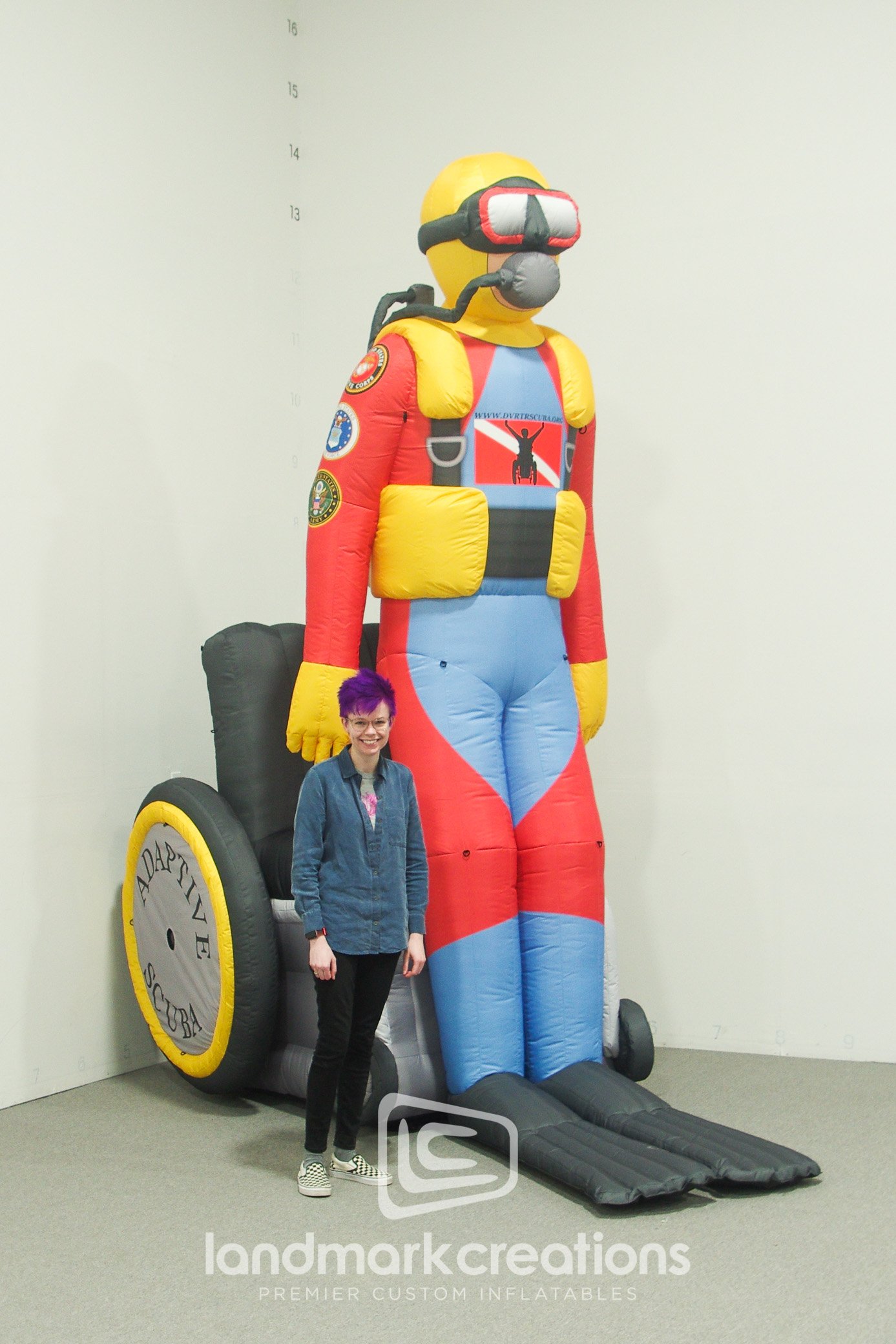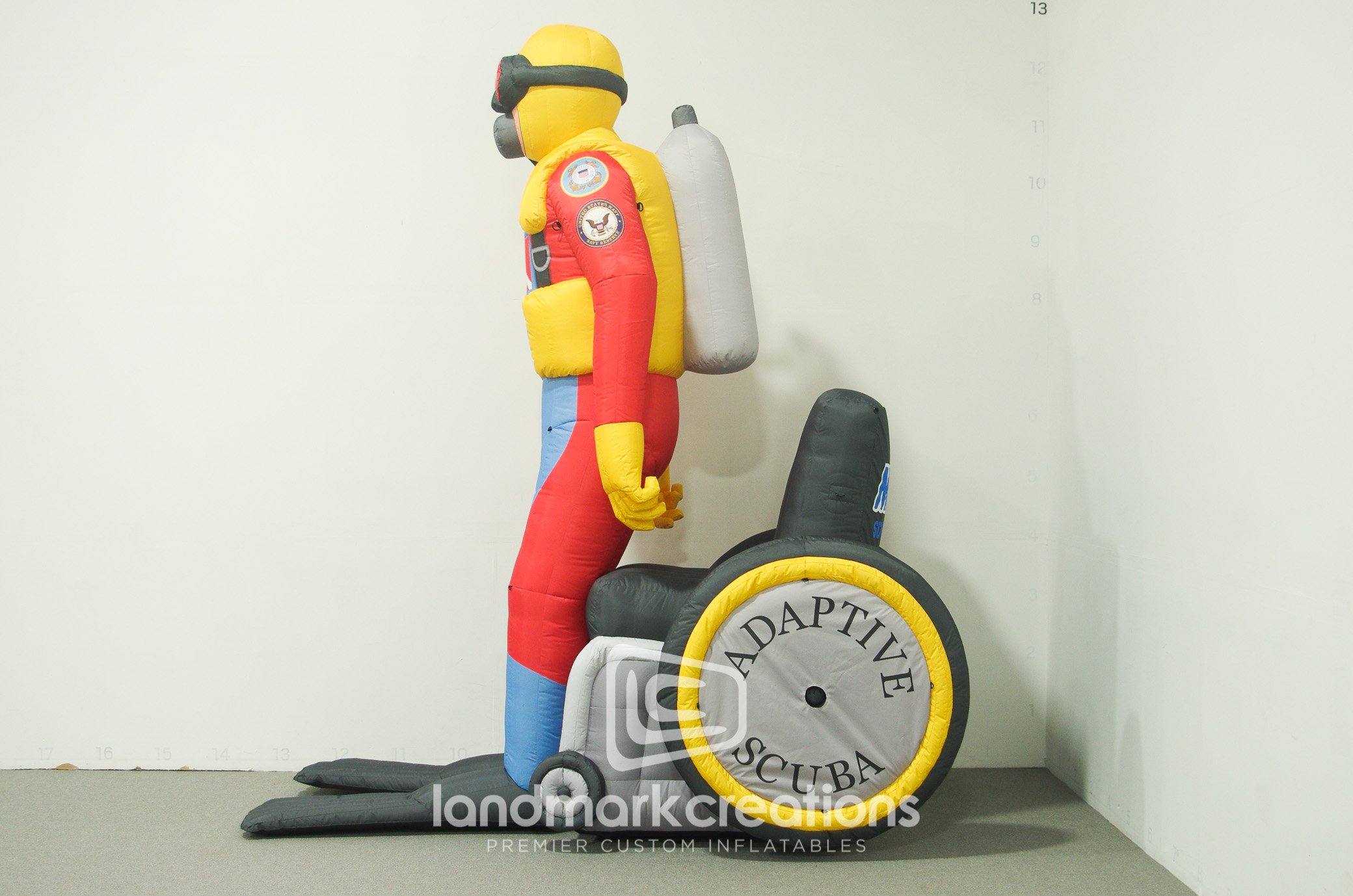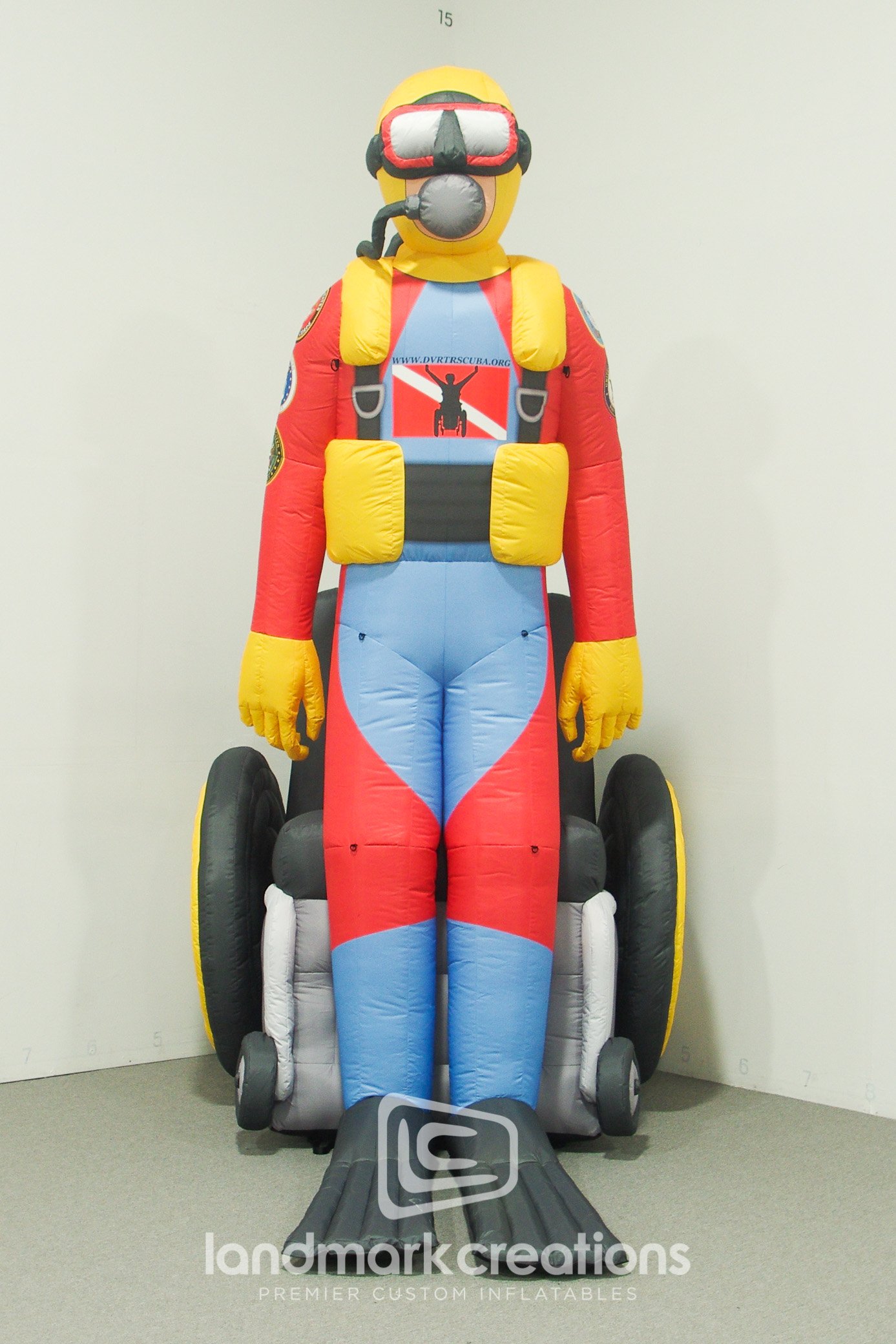 Disabled Veterans Restoration thru Recreation Scuba, a non-profit that that provides therapeutic scuba diving for wounded and disabled veterans, created this towering replica of one of their own- a scuba diver lifting himself up and out of his wheelchair, suited up and ready to dive. Inflated at diving events and fundraisers, the inflatable doubles as advertising space for current and potential sponsors as extra incentive for donors!