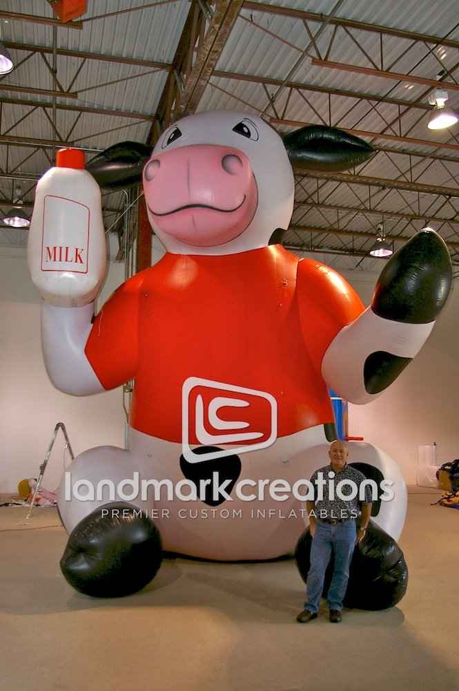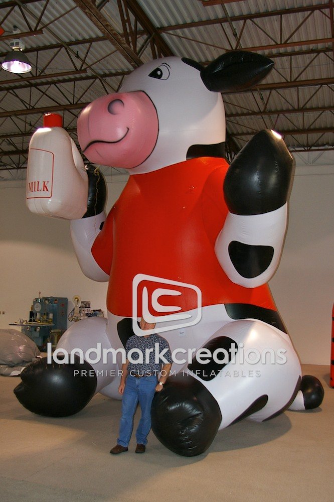 An inflatable cow mascot is a creative marketing tool for dairy product manufacturers. The inflatable cow holding a carton of milk with attract attention at special events, fairs and festivals.