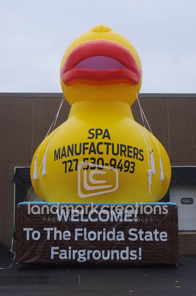 Spa Manufacturers inflated this giant rubber duck on a hot tub at the Florida State Fair to attract attention and increase sales. The massive inflatable duck can be seen from far and wide!