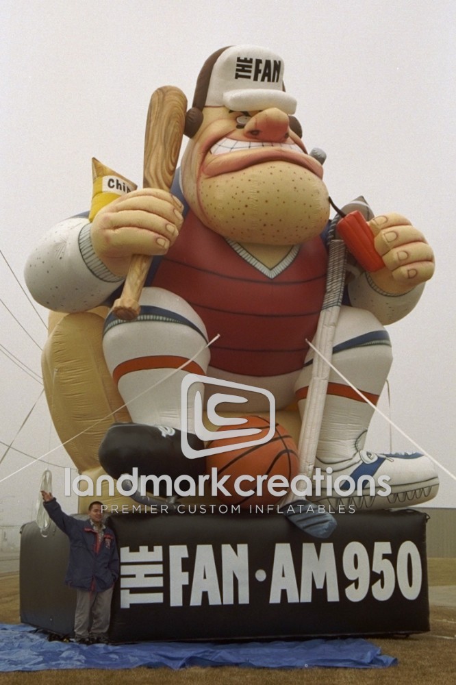 Need a fun way to attract radio station listeners at live events? This inflatable sports fan character, complete with baseball bat, basketball and recliner, speaks to fans of every sport.
