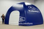 Subaru of America uses their giant, blue inflatable tent with digitally printed logos to promote the Subaru brand and keep crowds out of the elements at events.