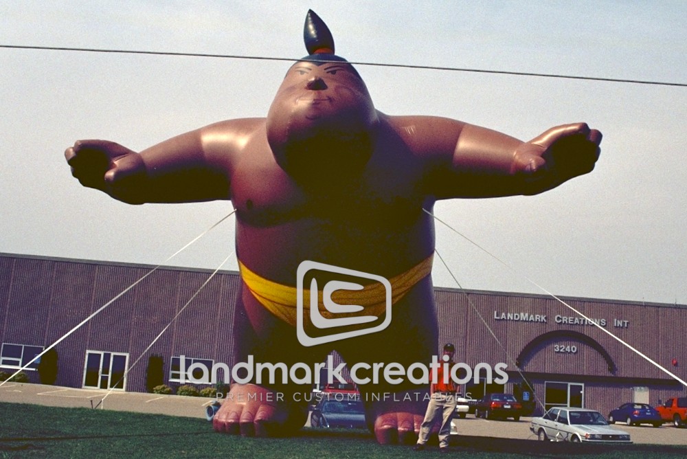 Inflatable mascots help bring businesses to life. This inflatable sumo wrestler was seen from far and wide when installed on rooftops!