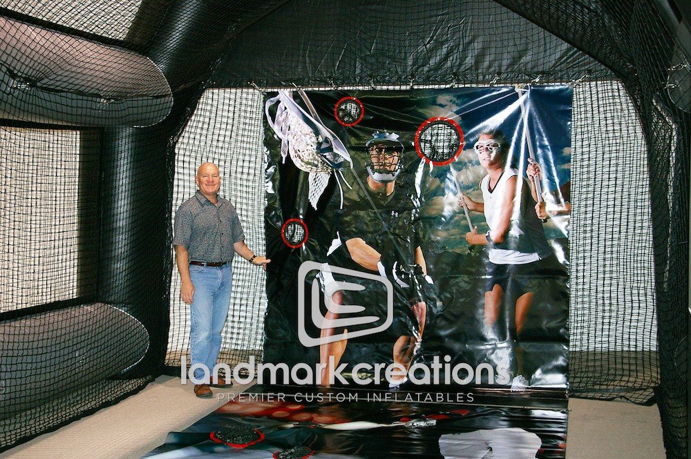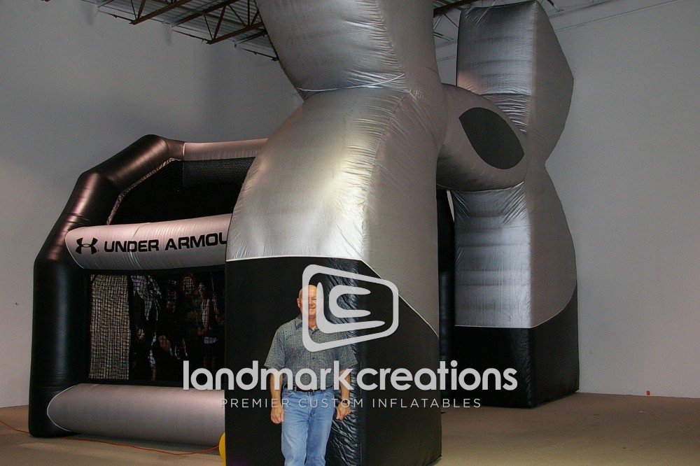 Performance apparel manufacturer, Under Armour, improves brand awareness at sporting events with this giant customized logo and sports cage inflatable combination.