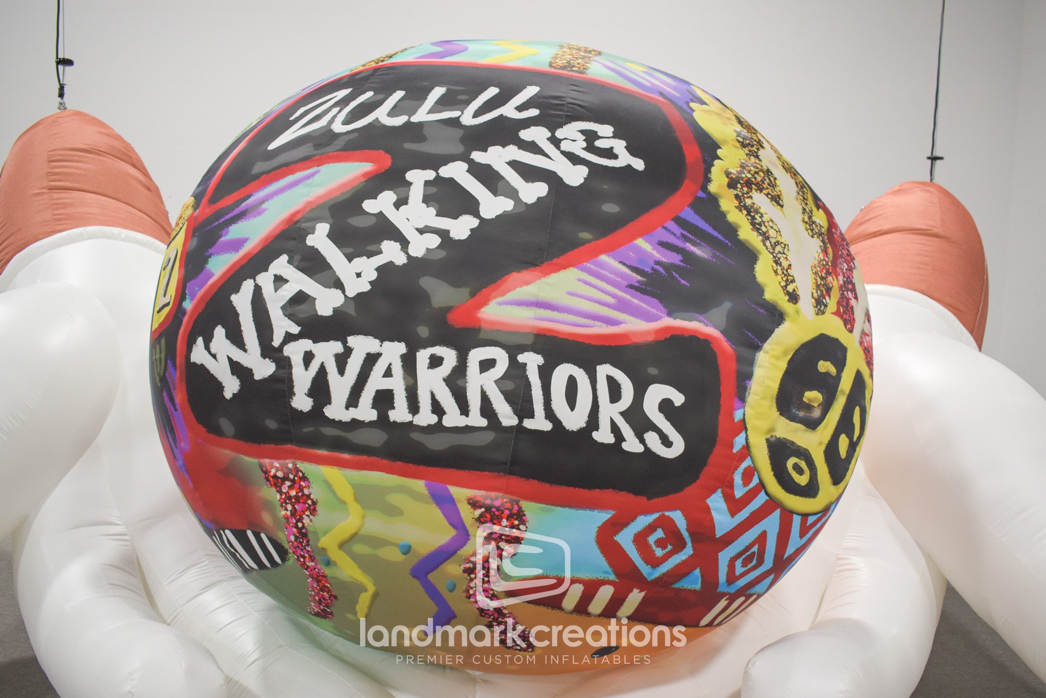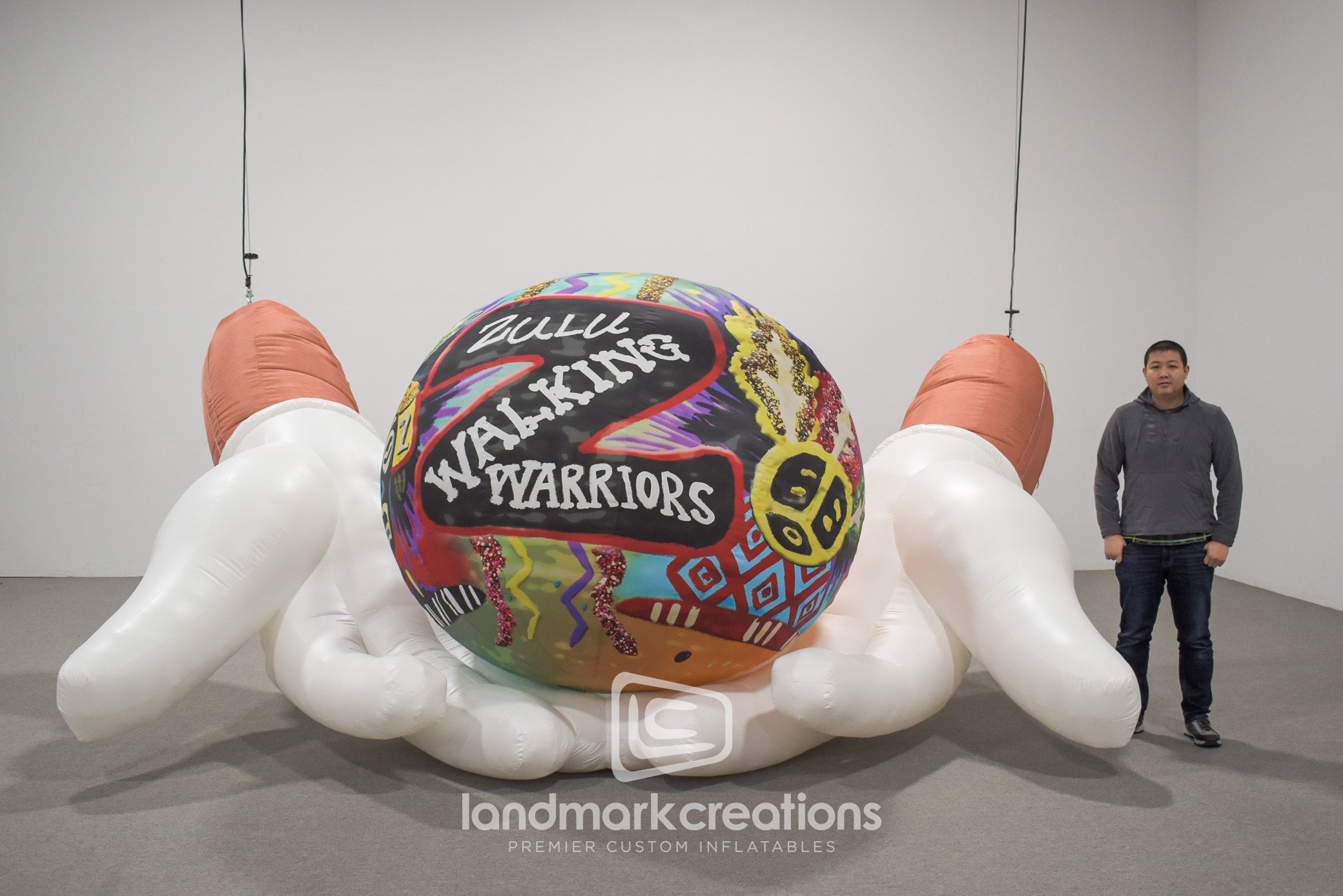 Stronghold Studios created a custom inflatable Mardi Gras display NOLA that was suspended at the Fauborg Marigny building. The inflatable display features two white gloved hands holding a zulu coconut in support of The Walking Warriors of Zulu. NOLA plans to use their custom inflatable at Mardi Gras events for many years to come.