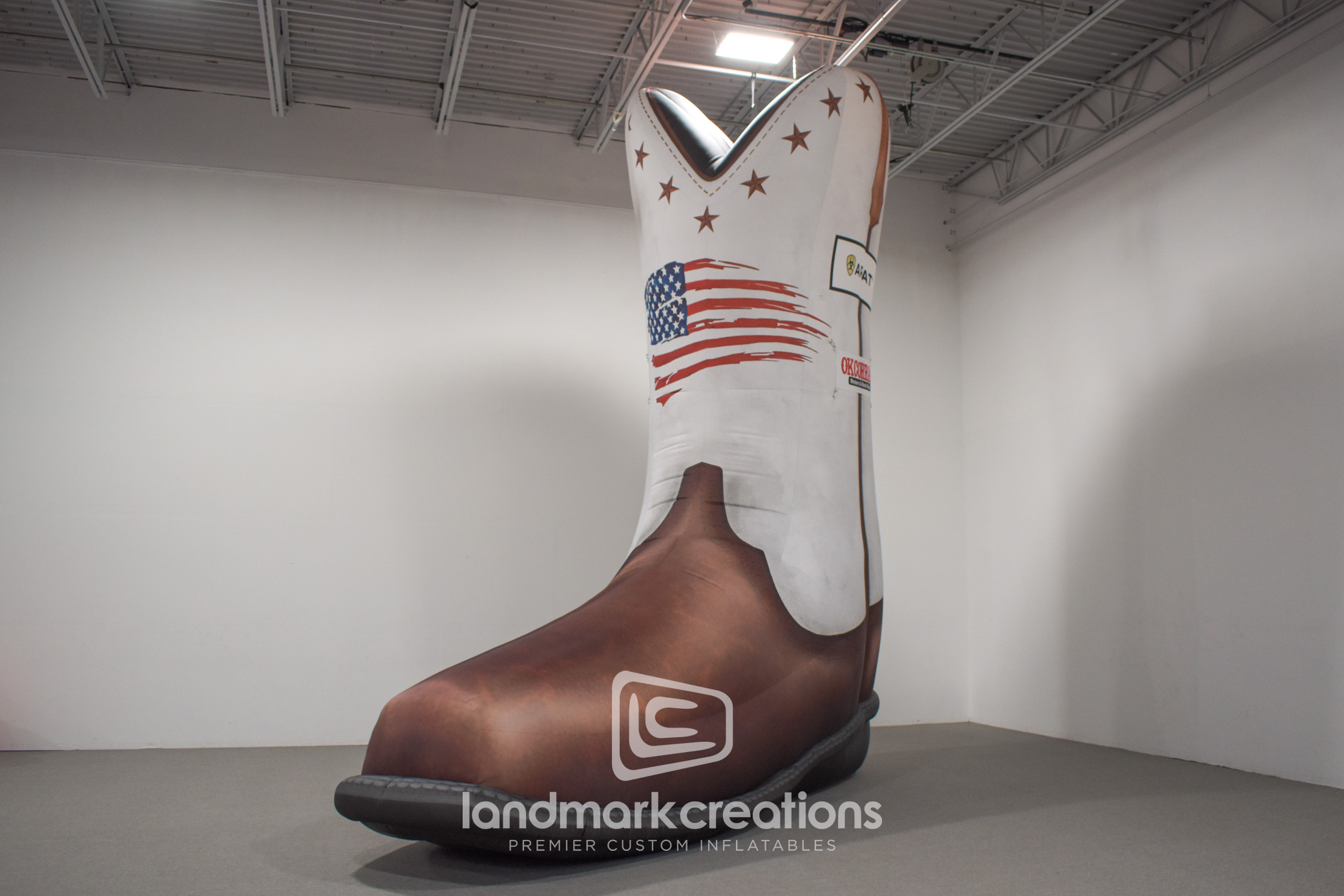 Landmark Creations partnered with OK Corral, a premier Western and workwear retailer in Vacaville, CA, to craft a custom inflatable replica of the iconic Ariat boot. This impressive outdoor display serves as a striking visual centerpiece, enhancing brand visibility and attracting customer attention. The boot features a meticulously printed logo, ensuring brand authenticity and durability for extended promotional use.