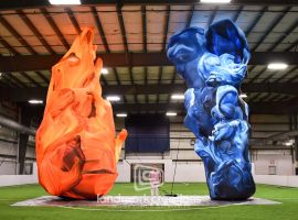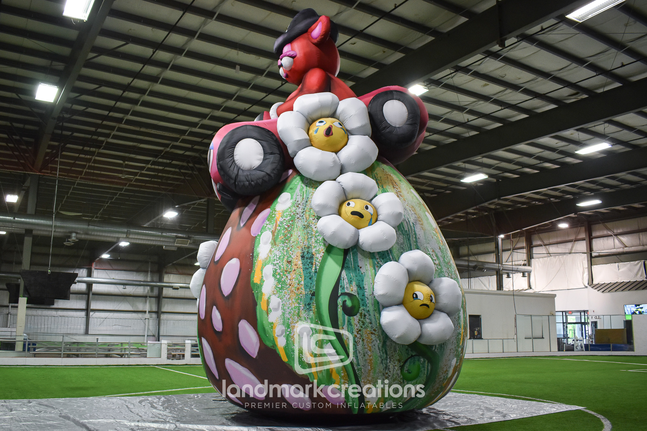 In collaboration with Art Production Fund and artist Alake Shilling, Landmark Creations brought Buggy Bear Loses Control in the Long and Winding Road to life as a 25-foot inflatable sculpture. Displayed outdoors in Los Angeles, this custom inflatable blends whimsy with scale, featuring a standing structure and three raised flower elements that help root the piece in its surreal, narrative world. Engineered for public display on museum grounds, this inflatable artwork invites passersby to engage with contemporary art in a bold and playful way.