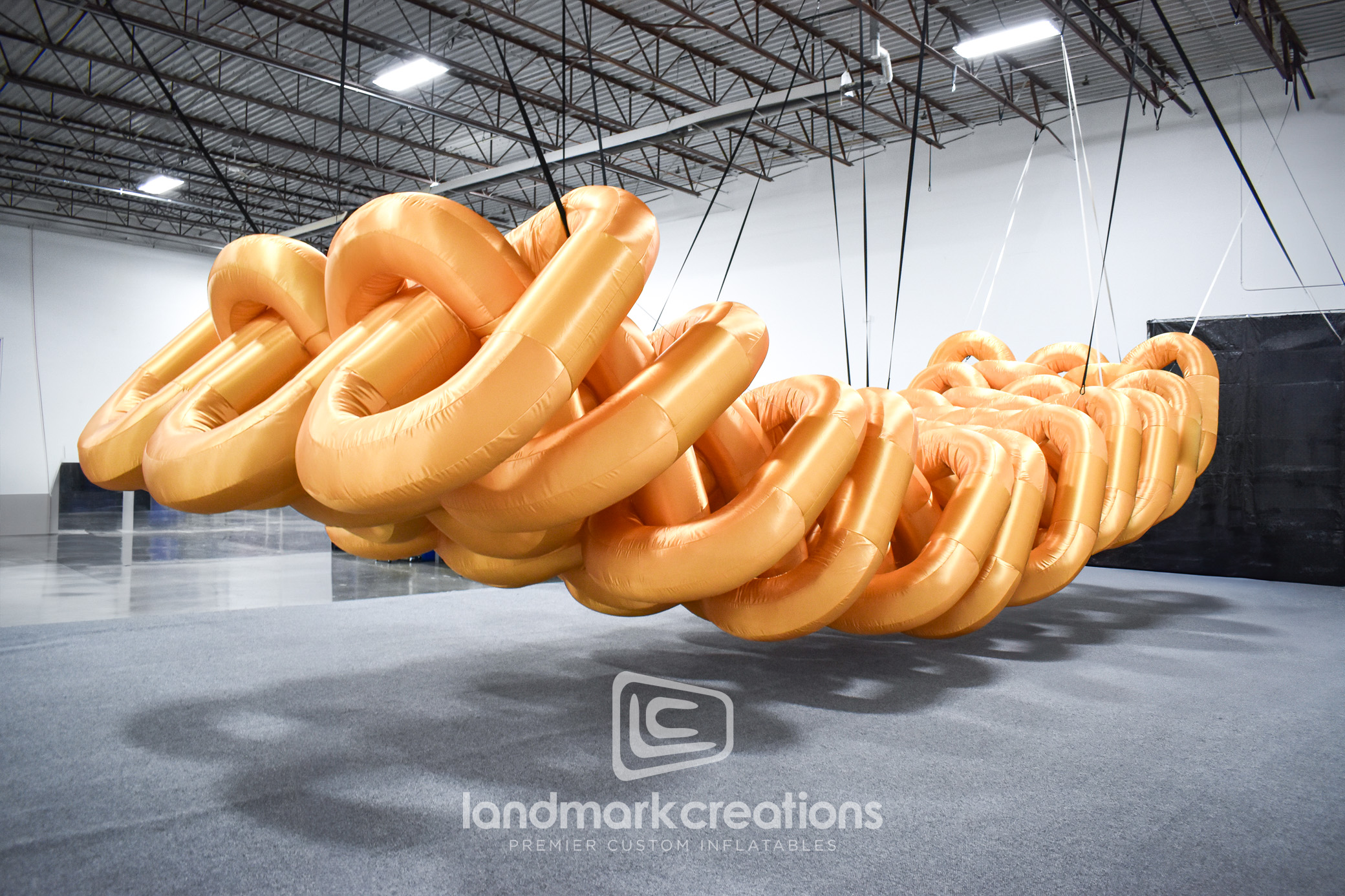 Commissioned by MASSIVart for the ROYALMOUNT shopping mall in Montreal, this custom inflatable art installation features two suspended chain link sculptures crafted from printed satin fabric. Designed to evoke the elegance of oversized jewelry, these pieces are displayed annually during the holiday season, enhancing the mall's festive atmosphere.