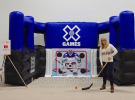 Fans of the New York Rangers get a chance to show off their hockey skills at games with this inflatable slap shot cage.