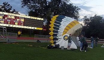The Waubonsie Valley Warriors are serious about football! So are their fans. So when they had the opportunity to buy custom inflatable tunnels they were excited. Sports inflatables offer some unique features other products don't. Custom designed, inflatable tunnels can take any shape and color you want. Naturally, the Warriors wanted something with an Indian motif. They decided on a headdress adorned in school colors.